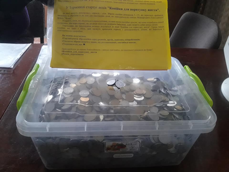 Перші результати благодійної акції "Копійки для порятунку життя" - 27 кілограм копійок, зібраних школярами Тернопільської школи #7.
