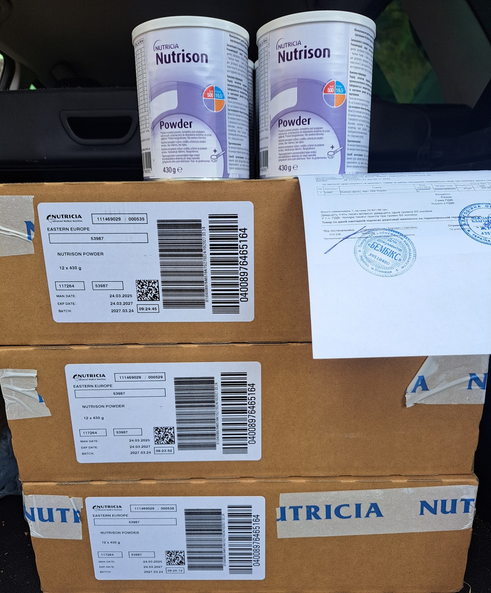 На фото — 40 банок Nutrison Powder на суму 25 821 грн, цього вистачить приблизно на два місяці.